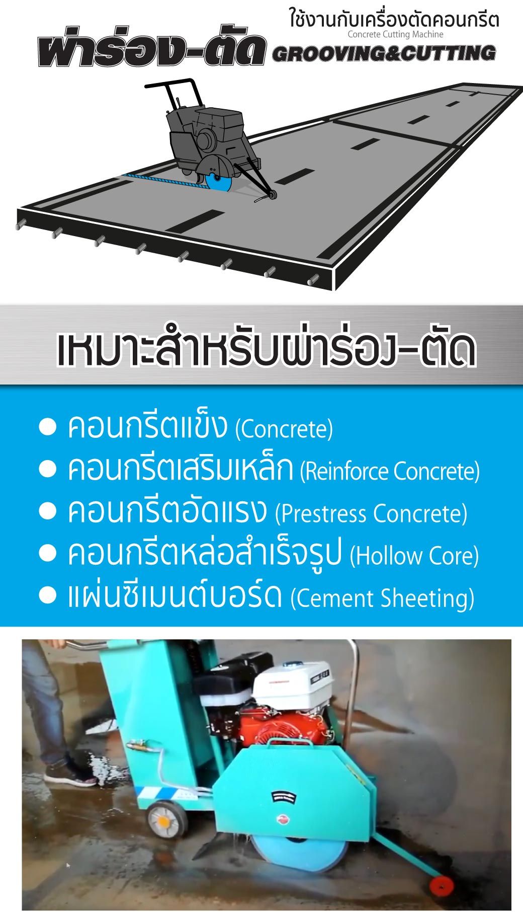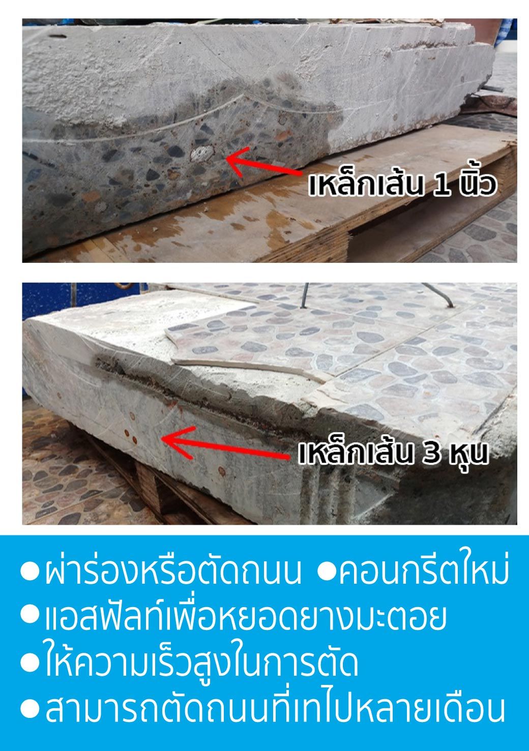• ผ่าร่องหรือตัดถนน คอนกรีตใหม่ แอสฟิลท์เพื่อหยอดยางมะตอย ให้ความเร็วสูงในการตัด ใช้กับรถตัดถนน สามารถตัดถนนที่เทไปหลายเดือน