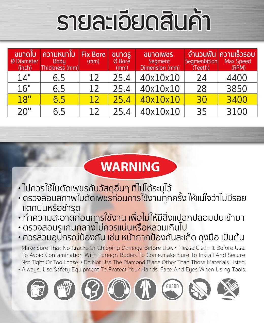 • ตรวจสอบสภาพใบตัดเพชรก่อนการใช้งานทุกครั้ง ให้แน่ใจว่าไม่มีรอยแตก บิ่น หรือชำรุด