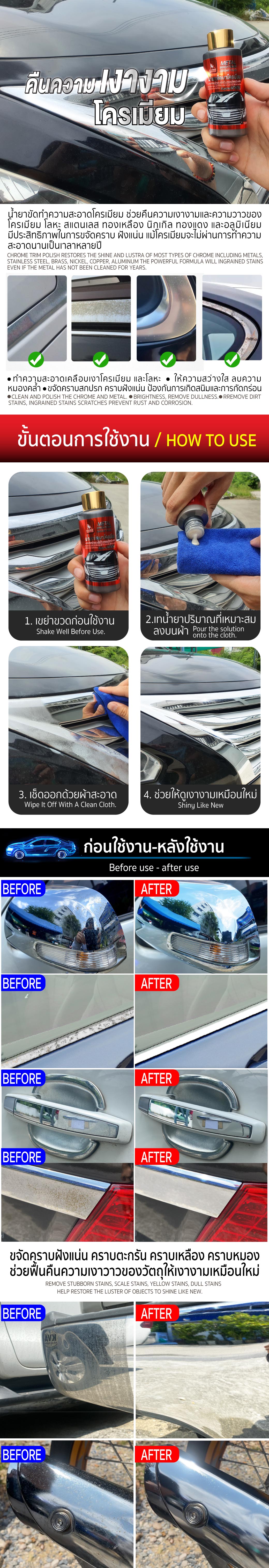 น้ำยาขัดเงา โครเมียม เพิ่มความเงางามให้กับพื้นผิวโครเมียม เช่น กระจังหน้ารถ โลโก้ ครอบไฟหน้า-หลัง