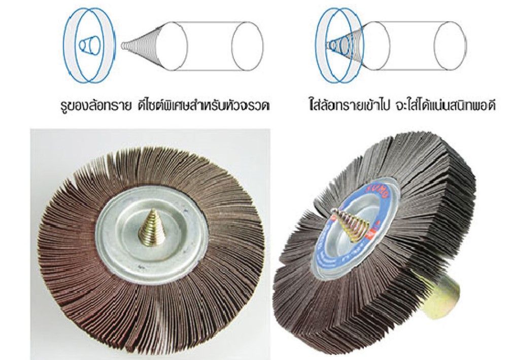 • รูปทรงเหมือนวงล้อเมื่อใช้งานจะเกิดความคมที่ต่อเนื่อง ขัดคราบต่างๆ ได้อย่างรวดเร็ว และมีช่องวางสำหรับระบายฝุ่น ทำให้ไม่อุดตันไม่เกิดความร้อนและรอยไหม้บนชิ้นงาน