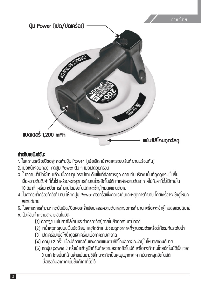 • ควรตรวจสอบสภาพจานดูดของ เครื่องดูดสูญญากาศไร้สาย รุ่น C200 SUMO ก่อนใช้งานทุกครั้ง หากมีรอยขาดหรือสิ่งสกปรกให้ทำความสะอาดทันที