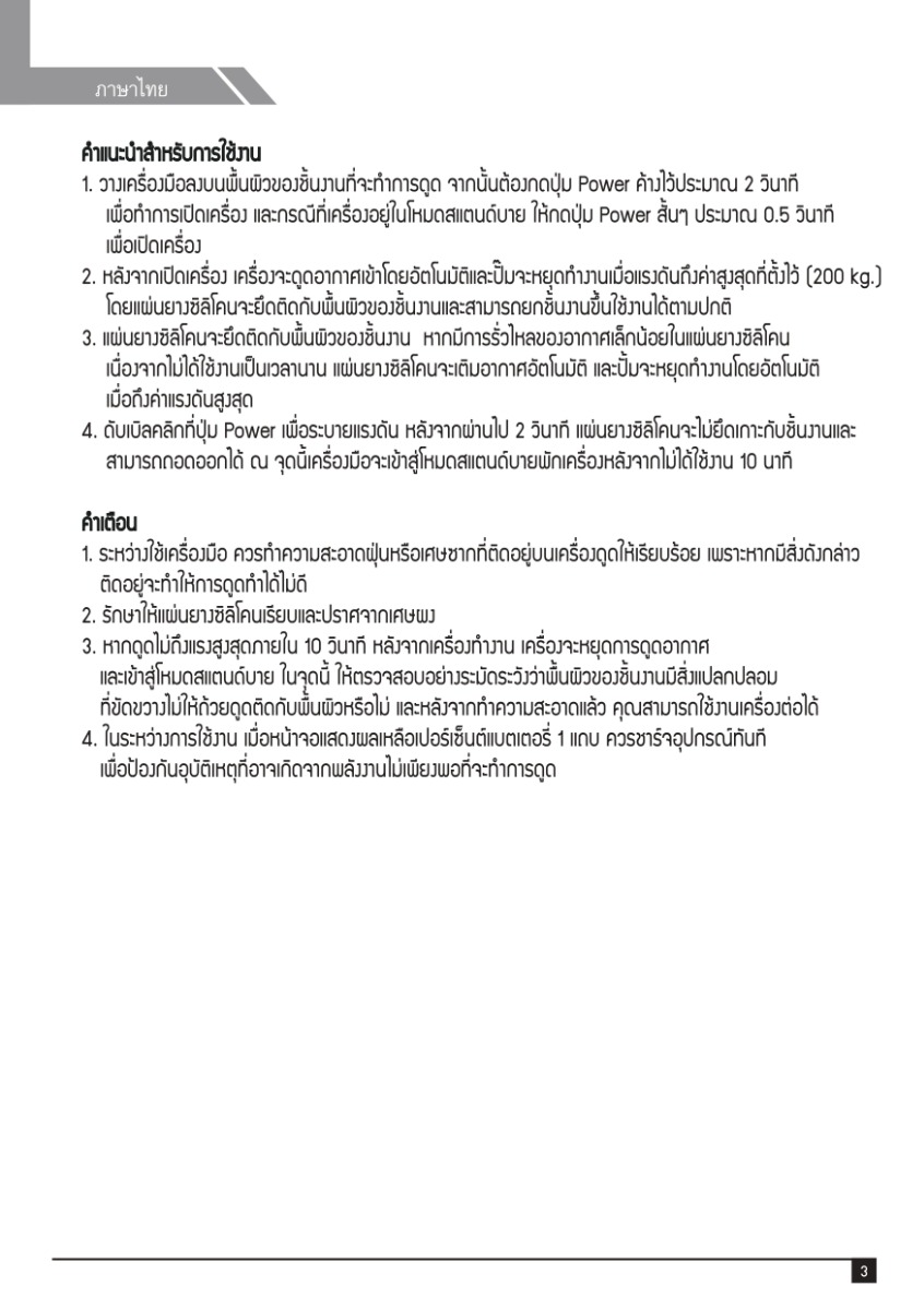 • หลีกเลี่ยงการใช้กับพื้นผิวขรุขระหรือเปียก เพราะอาจลดแรงดูด