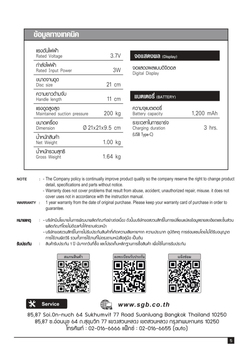 คุณกำลังรีวิว:เครื่องดูดสุญญากาศไร้สาย รุ่น C200 SUMO