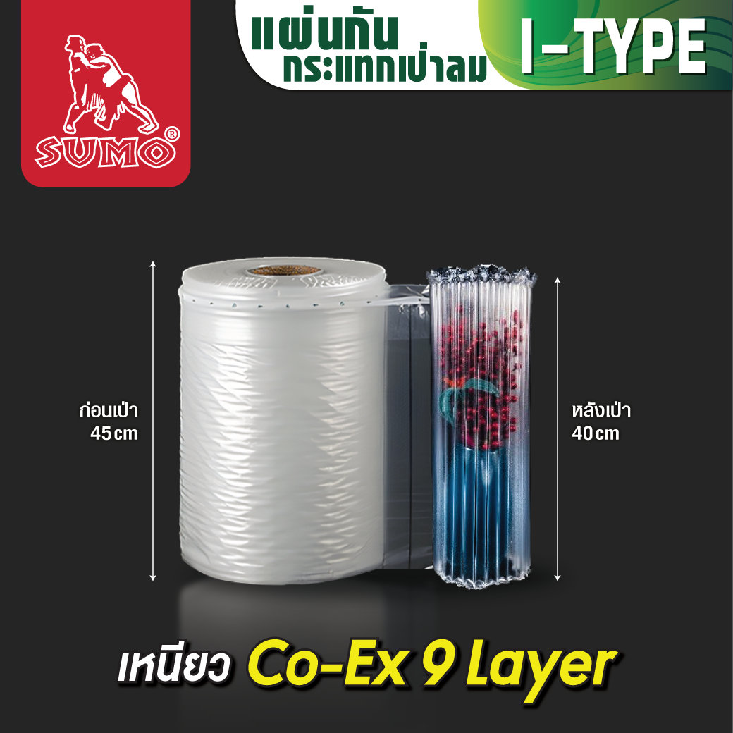 พลาสติกเป่าลมกันกระแทก กว้าง 45 ซม. หนา 55 ไมครอน ผลิตจากพลาสติก PE ผสมไนลอน เหนียว ยืดหยุ่น รับน้ำหนักได้ 80 กก. หนึ่งม้วนยาว 300 เมตร ตัดแบ่งความยาวได้
