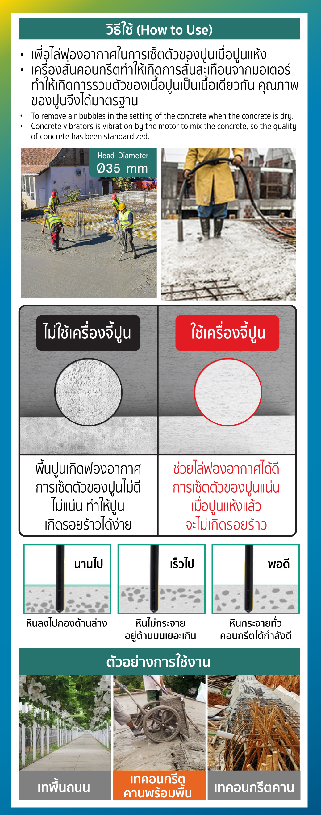 • เหมาะสำหรับงานก่อสร้างทุกประเภทที่ใช้ปูน และต้องการความประณีตเพื่อช่วยไล่ฟองอากาศ ในการเชทตัวของปูน เมื่อปูนแห้งแล้วจะไม่เกิดรอยร้าว